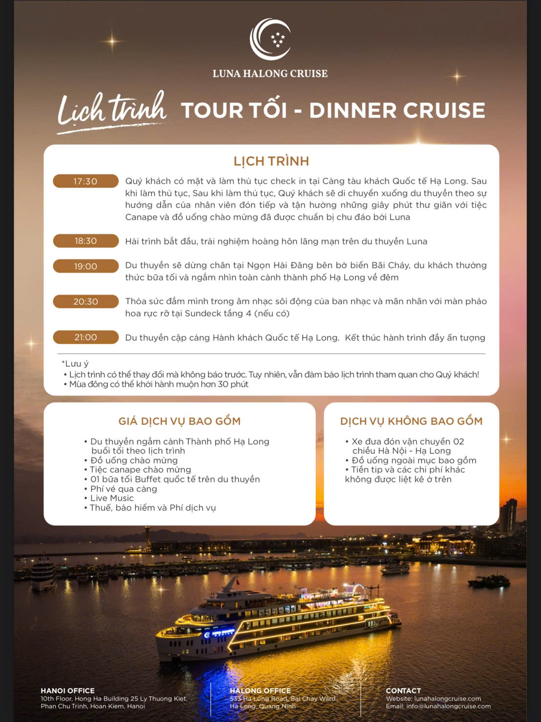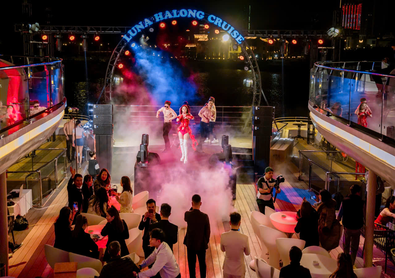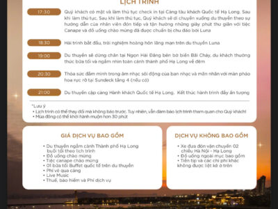 Quý khách ngắm nhìn khung cảnh lung linh tuyệt đẹp của thành phố Hạ Long về đêm trong khi du thuyền di chuyển qua các địa điểm nổi tiếng như cầu Bãi Cháy, Vòng quy mặt trời, núi Bài Thơ, Quảng Trường, Bảo Tàng Quảng Ninh, Cung Cá Heo …