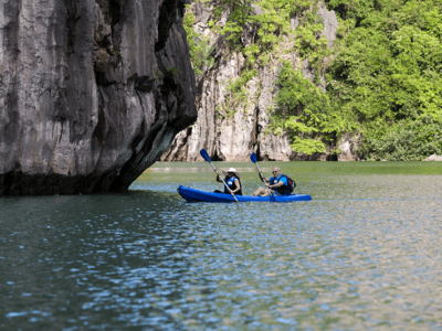 15:30: Tàu ghé thăm khu vực Ao Ếch – nổi tiếng với vẻ đẹp tự nhiên hoang sơ và phong cảnh nên thơ, cuốn hút của Vịnh Lan Hạ. Tại đây quý khách sẽ chụp ảnh lưu niệm phong cảnh thơ mộng, trữ tình của vùng sông nước. Đây cũng là thời gian tuyệt vời nhất để du khách tận hưởng hoạt động chèo kayak – vốn là một hoạt động gần gũi sông nước và khám phá nét đẹp chân thực nhất của những núi đá vôi và nước biển xanh của Vịnh Lan Hạ. Sau đó, du khách đắm mình và làn nước xanh mát của Lan Hạ với hoạt động bơi lội đầy phấn khích